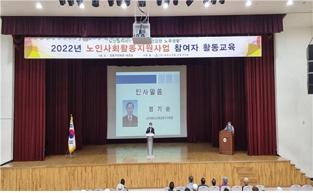 강동구지회(지회장 엄기순)는 지난 18일 강동구민회관 대강당에서 ‘2022년 노인 사회활동 지원사업 참여자 소양 교육’을 개최하였다. 이날 교육은 경로당중식도우미, 경로당시설도우미, 시니어안전파수꾼, 전통시장도우미, 크린스쿨누리단 총 5개 사업단에서 활동하고 있는 460여 명의 참여자를 대상으로 진행되었다.