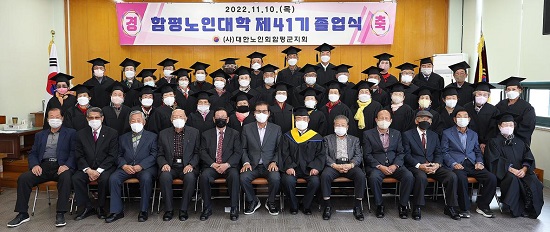 함평군지회(지회장 조용무)는 지난 10일 함평군회지회 대강당에서 함평노인대학 제41기 졸업식을 개최했다.  이날 졸업식에는 노인대학 졸업생 54명과 이상익 함평군수, 조용무 함평군지회장 등 70여 명이 참석했다.