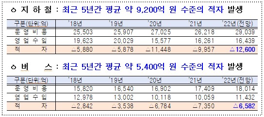 ’22년 현재 서울교통공사 공사채는 9천억원, 서울시 재정지원은 1조 2천억원 수준이며, 운영기관도 광고 및 임대사업 수익 등으로 매년 지하철 약 3천억원, 시내버스 약 500억원씩 자구노력을 이어오고 있다.