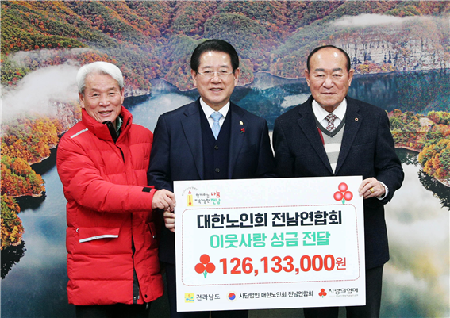 김영록 지사는 “이웃사랑 실천에 늘 앞장서온 대한노인회 전남연합회를 비롯한 지역 어르신들께 항상 존경과 감사의 마음을 갖고 있다”며 “녹록치 않은 경제 여건에도 모아주신 정성은 많은 어려움을 겪는 지역 어르신에게 큰 도움이 될 것”이라고 밝혔다.