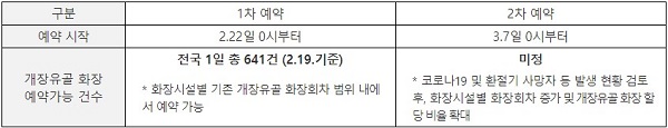 다만, 코로나19 유행이 아직 종식되지 않은 상황과 2~3월 환절기에 사망자가 증가하는 경향 등 일반 사망자가 언제든지 증가할 수 있는 점을 고려하여 개장유골 화장 사전 예약가능 건수를 단계적으로 확대하기로 하였다.