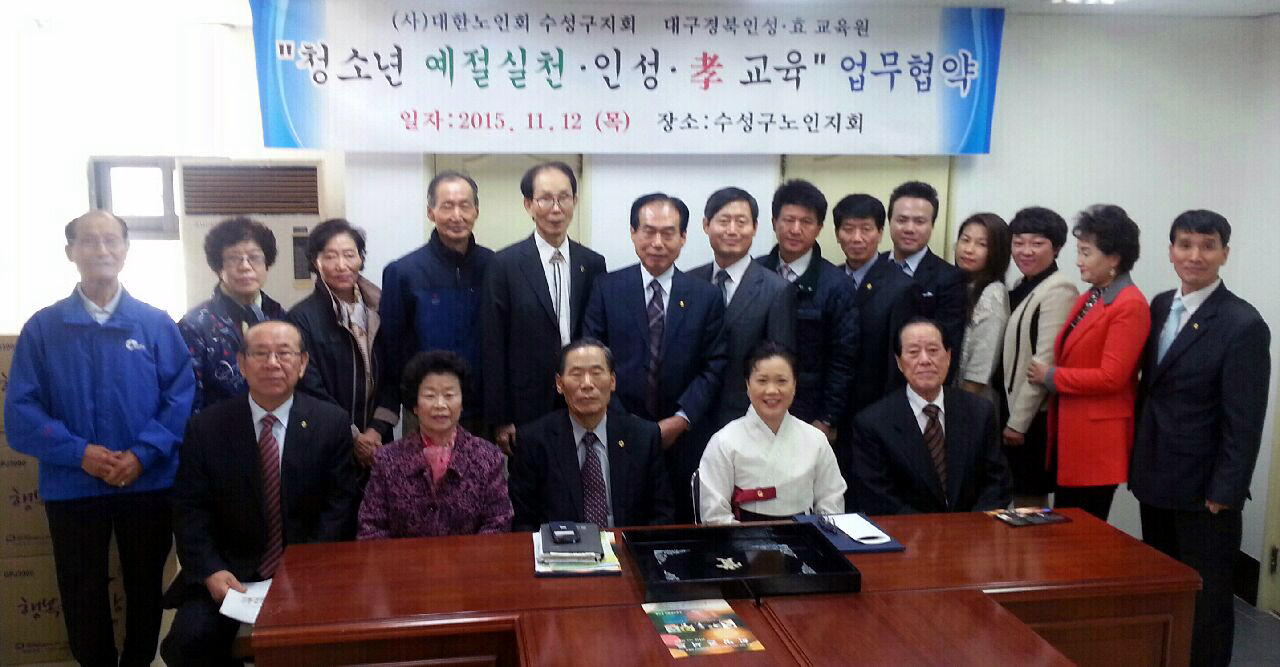 대한노인회 대구수성구지회(지회장 김국원)는 지난 12일 김국원 지회장과 수성구지회 산하 경로당 회장단 8명을 비롯하여 대구경북 인성 ‘효’ 교육원 김경화 원장 외 8명 등 16명이 참석하여 `효' 교육에 관한 MOU 체결을 하였다. 김국원 지회장은 21번째 MOU 체결을 축하하며 혼탁한 사회를 바로잡는 기틀은 오늘 같은 ‘효’ 교육이 잘 정착되어서 삼 세대인 손자 손녀들이 어른들을 자랑스럽게 예우하여 좋은 밑거름이 돼주는 것이라고 했다.