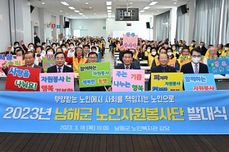 남해군지회(지회장 이재신)는 3월 16일 노인복지관 3층 강당에서 `남해군 노인자원봉사단' 발대식을 개최했다. `남해군 노인자원봉사단'은 각 지역(단체)별 8개의 노인자원봉사단으로 구성됐으며, 보다 더 적극적인 지역사회 참여를 위해 결성됐다.