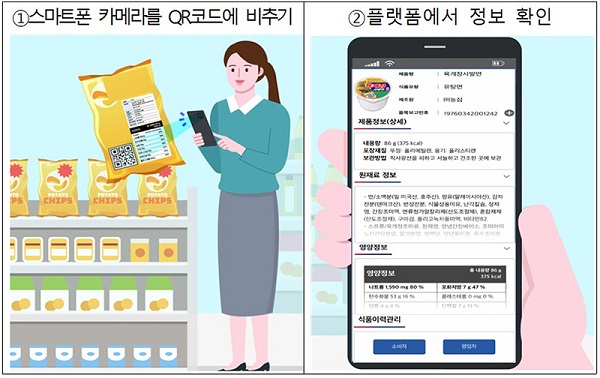 스마트폰으로 식품 포장지에 인쇄된 ‘QR코드’를 찍으면 제품명과 내용량(열량), 업소명, 소비기한(유통기한), 보관방법, 주의사항, 나트륨 함량 비교 등의 정보를 확인할 수 있다.