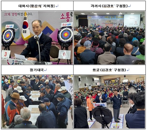 김경호 구청장은 격려사를 통해 장기⦁한궁대회는 어르신들이 화합하며 즐기는 행복한 시간이라며 심신의 활성화로 늘 활력이 넘치시기를 바란다며 어르신 복지 향상을 위해 더 열심히 노력하겠다고 말해 어르신들로부터 큰 박수를 받았다.