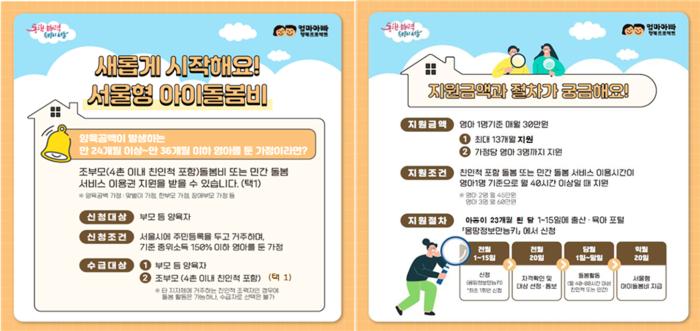 한편, ‘서울형 아이돌봄비’는 매달 1~15일 <몽땅정보 만능키> 누리집(umppa.seoul.go.kr)에서 신청할 수 있다. 지원대상은 24개월 이상 36개월 이하의 아동을 키우며, 맞벌이 등 양육 공백이 있는 중위소득 150%(3인 가구 기준 월 665만3천 원) 이하 가정이다. 아동이 23개월이 되는 달에 지원 신청할 수 있으며, 대상 연령 아동 1인 기준 월 30만 원씩 최대 13개월간 지원한다.