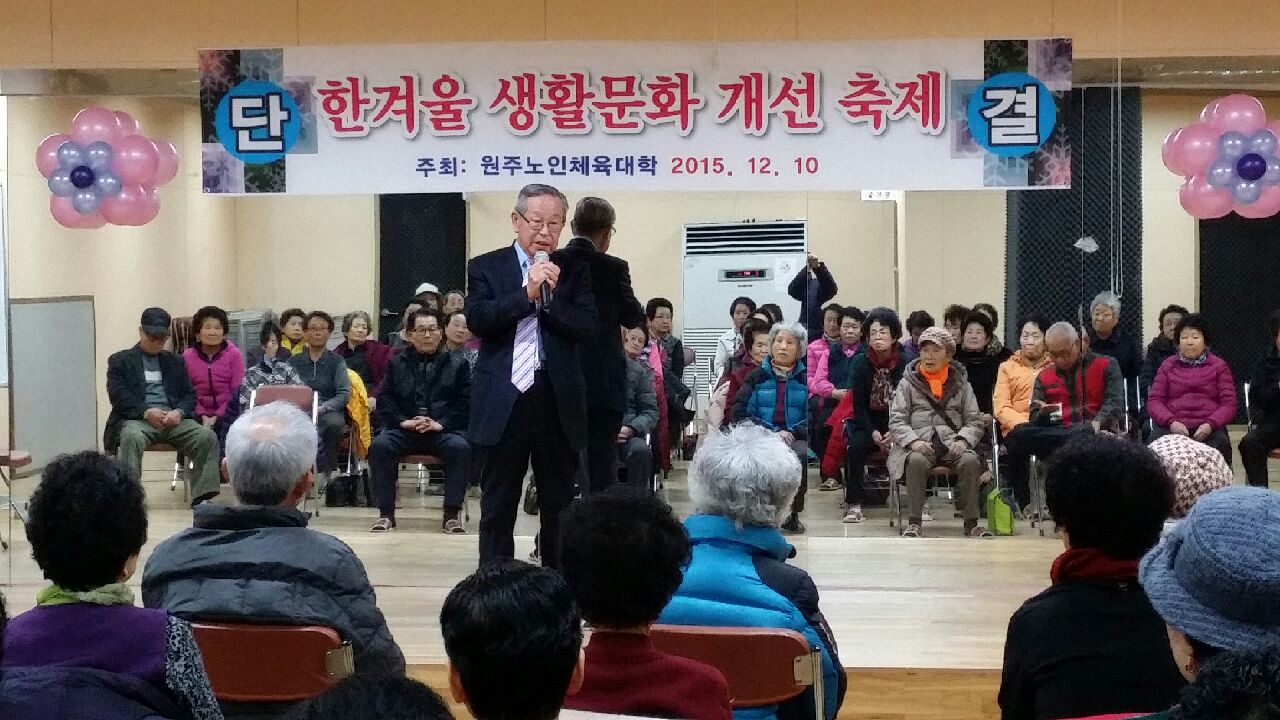 원주노인복지체육대학(학장 류인철)은 지난 10일 원주시 노인종합복지관 남부노인문화센터 대강당에서 ‘한겨울 생활문화 개선 축제’를 개최했다.