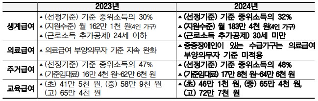 그 밖에 다인·다자녀 가구 자동차 재산기준을 완화하고 청년 수급자에 대한 근로·사업소득 공제대상도 확대(24세 이하→30세 미만)된다.