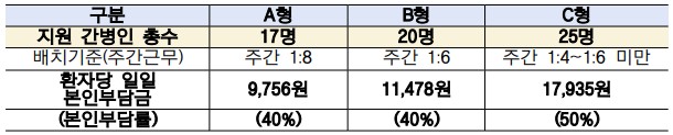병원이 선택한 간병인 배치 유형(A형, B형, C형)별로 병원당 17명에서 25명의 간병인력 인건비와 관리ㆍ운영비를 지원한다.