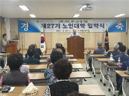 이종하 어르신복지과장은 "제27기 대한노인회 경산시지회 부설 노인대학 입학식을 진심으로 축하드리며 경산의 큰 자산인 어르신들이 노인대학을 통해 그 뿌리를 더 단단히 내려 미래로 성장하는 경산을 위해 힘써 주기를 당부드린다”고 했다.