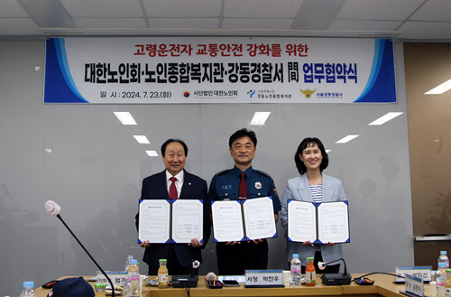 강동구지회(지회장 엄기순)는 강동노인종합복지관(관장 성미선), 서울 강동경찰서(서장 박찬우)와 7월 23일 강동경찰서 해오름홀에서 ‘고령 운전자 교통안전 강화를 위한 업무협약’을 체결하였다.