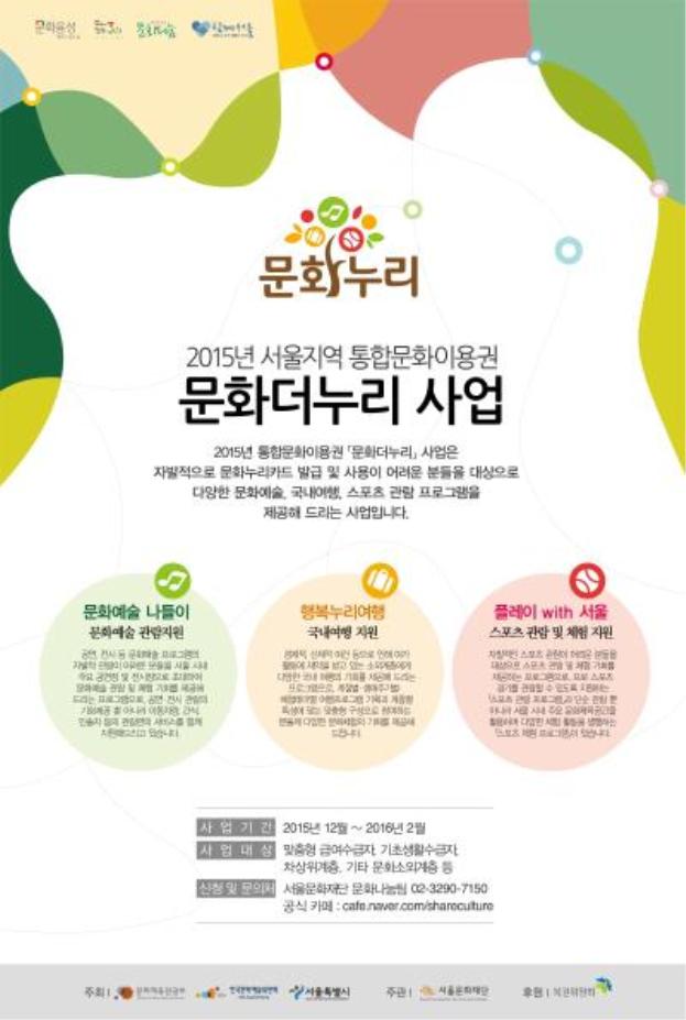 서울시와 서울문화재단은 거동이 불편해서, 자격 조건에 못미쳐서 등을 이유로 '15년에 문화누리카드(통합문화이용권)를 발급받지 못한 서울 거주 맞춤형 급여수급자, 기초생활수급자, 차상위계층, 장애인, 고령자 등 문화소외시민 약 2만 명을 선정, 혜택을 제공한다고 밝혔다. (선착순 신청)