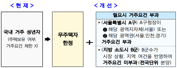 예를 들어, 시세차익이나 분양 경쟁이 큰 지역에서는 지자체가 해당 지역에 거주조건을 부여(해당 광역지자체 또는 해당 광역권)하고, 그렇지 않은 지역에서는 거주요건 없이 전국 단위로 청약을 시행할 수 있다.