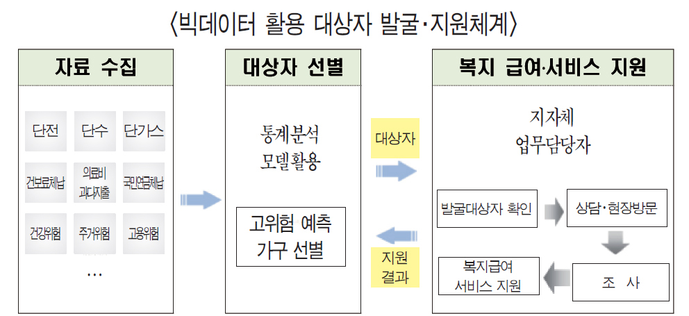 그러나, 여전히 많은 분들이 자격이 있음에도 복지 혜택을 받지 못하고 있으므로 보건복지부는 빅데이터를 활용한 복지 대상자 발굴과 지원을 보다 강화하여 지속적으로 추진할 계획이다.