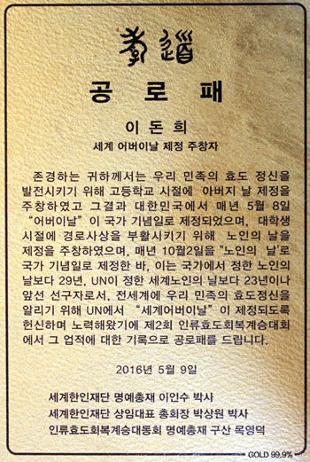 인류 효도 특강을 한 이인수 박사는 “우리 사회는 다양한 부문에서 사랑이 절대적으로 많이 필요합니다. 특히 부모를 존경하고 사랑하는 효도의 정신은 반드시 필요한 사랑 중의 하나라고 할 수 있겠습니다. 이러한 사랑의 정신이 확대되어서 이 사회 나아가서는 우리 민족과 세계를 밝히는 등불이 되기를 간절히 기원합니다”라고 했다.
