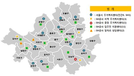 SH공사는 SH공사 본사에 컨트롤센터 역할을 하는 중앙 주거복지센터를 설치하는 한편 서울을 4개 권역으로 나눠 4개 지역 주거복지센터를 마련해 27일부터 본격적인 주거복지 상담에 돌입했다.