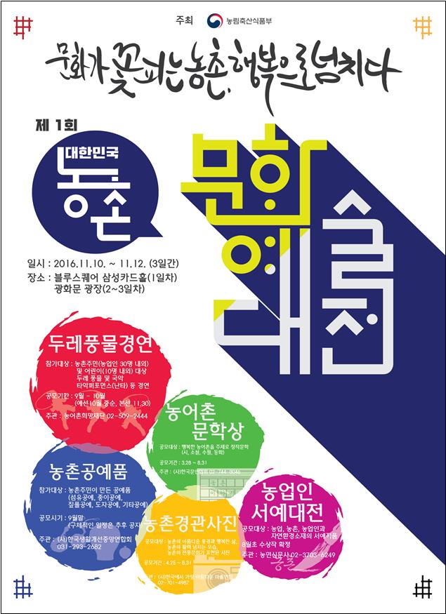 농촌문화예술대전은 공예·서예·사진·문학·타악을 포함한 농악 등 5개 분야에 대해 실시되며 농촌 주민이라면 누구나 참가할 수 있다.