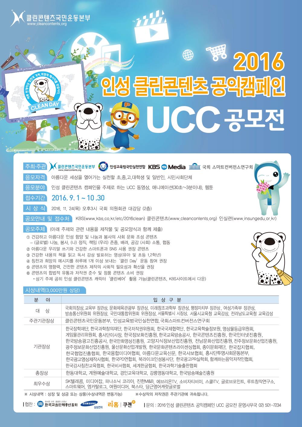 인성교육진흥법 시행 1년째인 금년에 학교와 사회의 인성을 함양하고 건전한 미디어 사용과 건전한 콘텐츠를 확산하여 아름다운 세상을 만들어 가고자 (민)클린콘텐츠국민운동본부(대표 안종배 한세대 교수)와 인성교육범국민실천연합(대표 김정호 삼락회 회장), KBS미디어(대표 이선재 사장), 국회 스마트컨버전스연구회(대표 심재철 국회 부의장)의 공동주관으로 `2016 인성 클린콘텐츠 공익 캠페인 UCC 공모전’이 9월 1일부터 전국 최대 규모로 개최됐다.