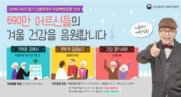 ‘생애주기별 맞춤복지’사업의 일환으로 지난해 처음 실시된 ‘인플루엔자 무료예방접종 확대 사업’은 어르신들의 불편해소와 건강증진 두 마리 토끼를 잡은 사업으로 평가받고 있다. 실제로 지난 절기(2015-2016)의 경우 우리나라 전체 65세 이상 인구(2015년 기준 670만 명) 중 545만 명(접종률 81%)이 인플루엔자 예방접종을 마쳤다.