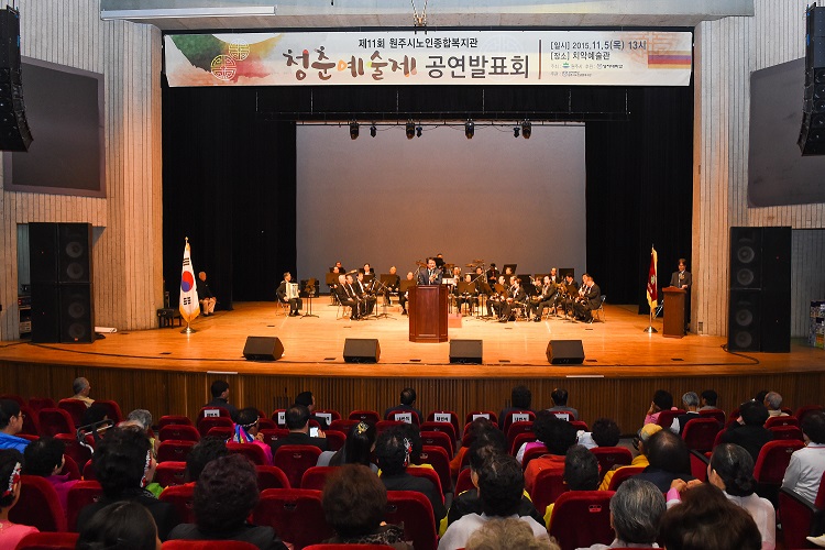 | 원주노인종합복지관 청춘예술제에서 축사를 하고 있는 원창묵 원주시장. |