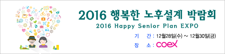 (주)동아전람이 주최하는「2016 행복한 노후설계 박람회」가 2016년 12월 28일부터 12월 30일까지 강남 COEX(코엑스)에서 개최된다.