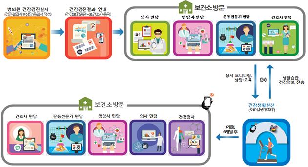 이용자는 보건소를 방문하여 맞춤형 건강관리 목표를 받은 후, 모바일 앱으로 운동?식사 등의 생활습관 개선 목표를 이행할 수 있도록 수시로 관리 받고, 건강?운동?영양 등의 전문 상담도 월 3~4회 받는다.