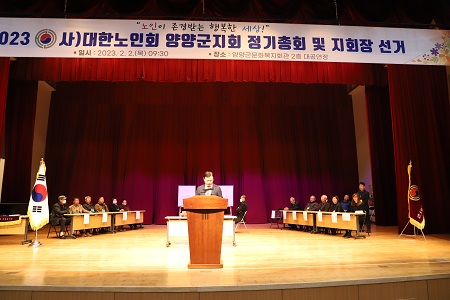 양양군지회는 2023년 정기총회 및 제19대 양양군지회장 선거를 선거 대의원인 지회 임원, 경로당 회장을 대상으로 양양군 문화복지회관 2층 대강당에서 개최하였다.