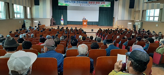 전주시지회(지회장 전영배)는 4월 27일 완산구 314개 경로당 회장, 4월 28일 덕진구 경로당 329개(총 643개) 경로당 회장들에게 그간 갈등 요소가 많았던 경로당에 대하여 문제점 해소 및 경로당 운영에 필요한 교육을 하였다.